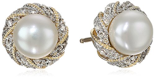 10k Yellow Gold Twist-Frame Freshwater Cultured Pearl Earrings With Diamonds Accent Stud Earrings