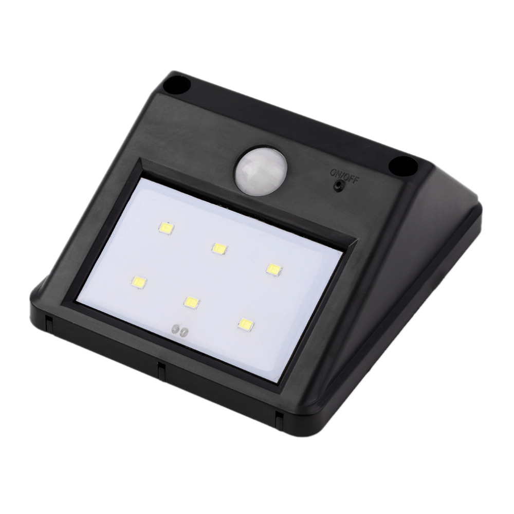 | Features: 100% Brand new and high quality! This solar power motion sensor lamp is waterproof heatproof and durable. It is widely used for illumination in outdoor courtyard balcony wall street garden plaza etc. Light the entrance to your homeWhen its dark the PIR detects anyone approaching the door and automatically turns the LED lights on for them then times out after 30 seconds The batteries recharge during the day to provide light at night. No wiring needed. Specifications: Body Material: Plastic Color: Black Size: 10cm x 8.5cn LED quantity: 6pcs 2835 SMD LEDs LED Power: 1W Lithium Battery: 3.7V 600mAh Solar panel: 6V 100MA 0.44W Color Teperature: 6000K-6500K Working Distance: 2-5M Package includes: 1 x Solar Light Wall Light 2 x Mount Screws 1 x Switch Pin 2 x Expansion pillar-hinge |