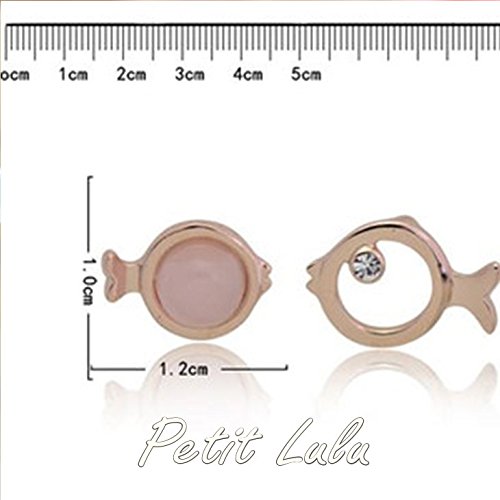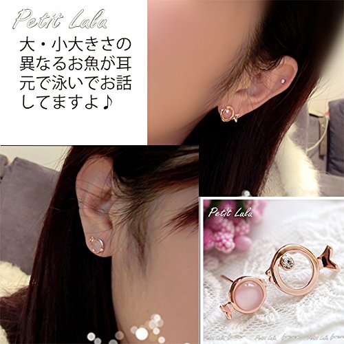 大・小大きさの異なるお魚が耳元で泳いでお話しているようなピアスです。小さい魚はピンクキャッツアイを使ったぷっくりお腹です。デートにつけていきたいピアスです。