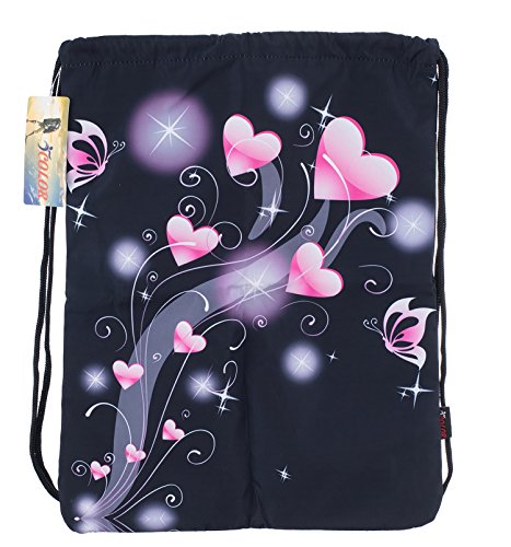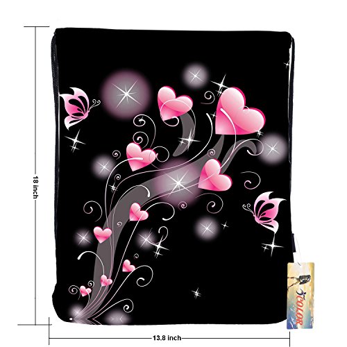 ICOLOR Sackpack Drawstring Bags Polyester Backpack Outdoor Sports Gym Bag Yoga Runner Daypack Team Training Gymsack (Black w/Pink Heart)