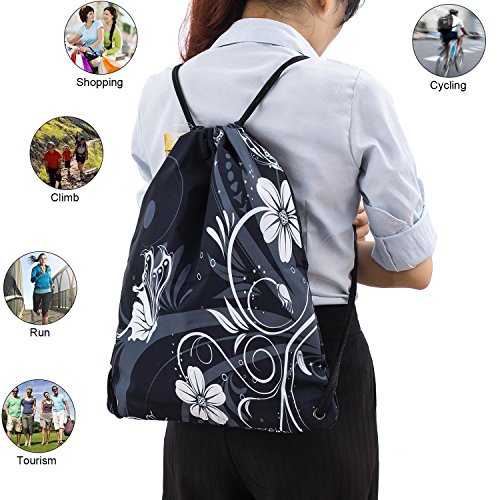 ICOLOR Sackpack Dance Bag Drawstring Backpack Gym bag Gymsack for Women Men Girls (Black w/White Flower)