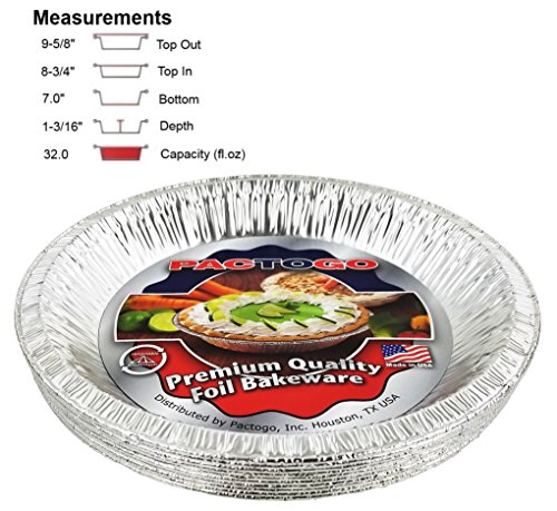Premium quality pie pans by Pactogo. These pie pans are listed by the manufacturer as a 10" pie, however the manufacturer rounds up the actual top-out diameter which is just short of 10" at 9-5/8". The dimensions below list the precise measurements of this pan.