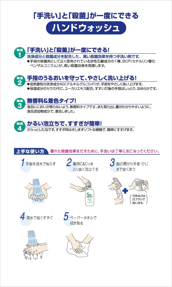 Medicated C & C 10 is a hand sterilizing detergent that can be handwashed and sterilized at once by blending a cleansing ingredient that is hard on the hands and a disinfectant with Kao's proprietary technology.