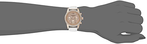 -. Feature : Crystal pave rose gold dial featuring three hand movement with two time zone sub dial, day and date register and tachymeter scale on inner bezel / Individually hand applied rose gold tone roman numerals and stick index with luminescent filled rose gold tone hour and minute hands / Polished rose gold tone alloy case with crystal bezel and crocodile embossed white genuine leather strap / Quartz movement with analog display / Water-resistant to 30 M (100 feet)