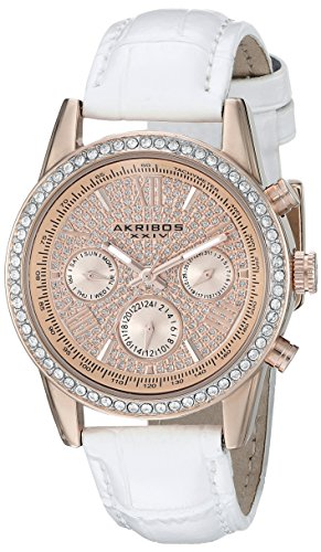 -. Title : Akribos XXIV Women's AK871WTR Crystal Accented Two Time Zone Pave Dial Rose Tone and White Leather Strap Watch