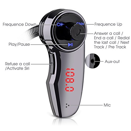 - Feature : Apart from the standard functions, we innovatively put the answer a call, end a call, redial a call ,next track ,Pre track into a single protruding button. This will create great conveinence to the car drivers. / We always keep pace with times, that's why we add the Siri function to the Mpow Streambot Flex, thus you can activate the voice software by clicking the sided button. / 2.1 A car charger, the updated car charger now can provide much higher charging speed, so as to charge your ipad with ease. / Adjustable and flexible. The high quality neck, combined with the rotatable head can be adjusted to arbitrary angle to suit your perfect view. / Also a Bluetooth Receiver: The provided 3.5mm cable can turn your FM transmitter into a bluetooth receiver. No bother to match the FM channel!