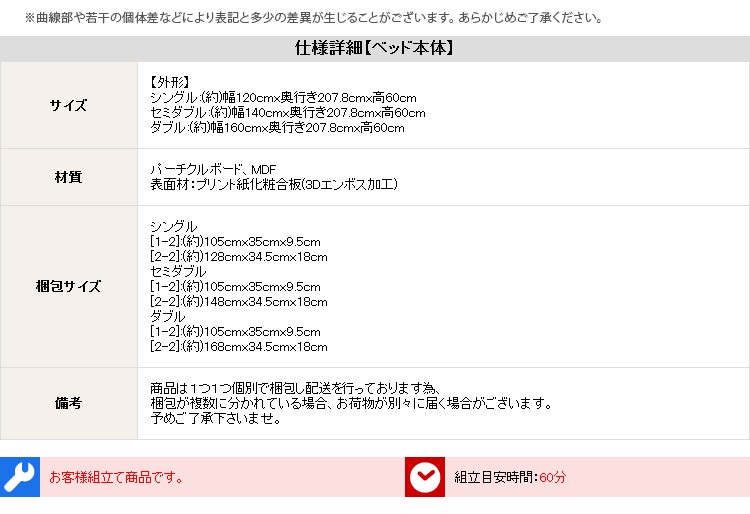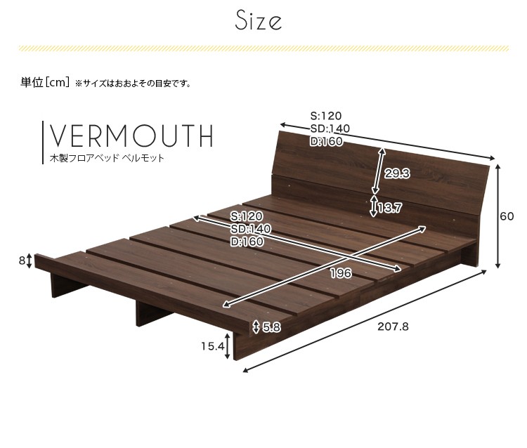 【商品について】 木製フロアベッド【ベルモット-VERMOUTH-(シングル)】 ■サイズ: 外寸:(約)幅120x奥207.8x高60cm ※商品重量:(約)39kg ■カラー: ウォールナット オーク ■素材: パーチクルボード、MDF、表面材:プリント紙化粧合板(3Dエンボス加工) ■その他: ・お客様組立商品です ・梱包サイズ: (1-2)(約)105.5x35.9x10.2cm (2-2)(約)127.4x35.3x18.5cm ・梱包重量:(約)43kg ※メーカー直送品、代引き不可【商品について】