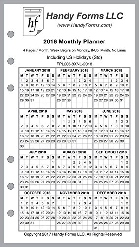 Personal size monthly planner fully dated for 2018. Includes yearly calendars for 2018 and 2019. With tabs. Months are separate allowing sheets to be inserted between months. Without lines.