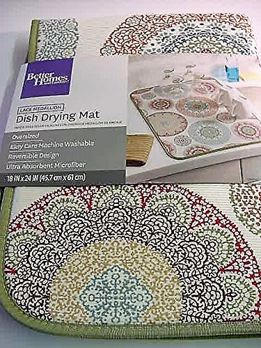 Studio : Walmart Publisher : Walmart Product Description The mat has the lace medallion design on the one side and a plain lime green on the other side. The tips from Better Homes and Garden are: style and functionality, ideal for drying delicate stemware and dishes, use mat to hold freshly washed dishes or rest beneath your dish drying rack. It is 100% polyester. Be sure to read care instructions for mat located on the information page. 0