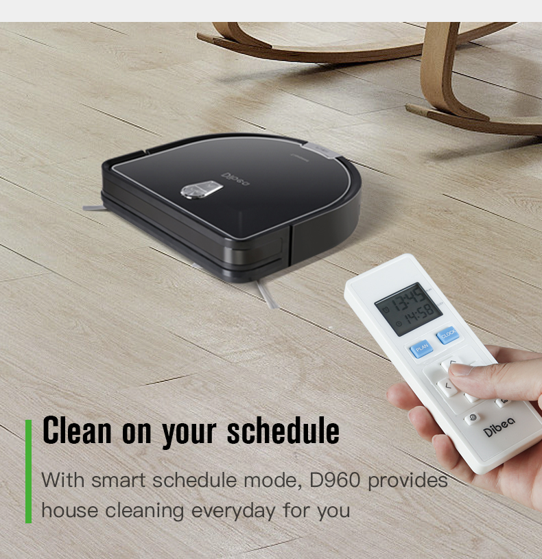 Preset the D960 to make it clean at a certain time everyday. Conveniently schedule with the remove control. Self-docks and recharges when battery power is low.