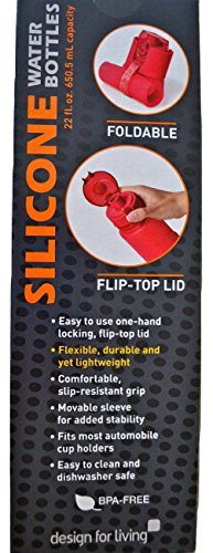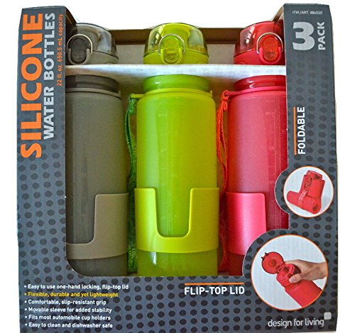 Design for Living Silicone Foldable Water Bottle with Flip-top Lid and Strap 22-ounce - Gray, Lime-green & Red 3-pack