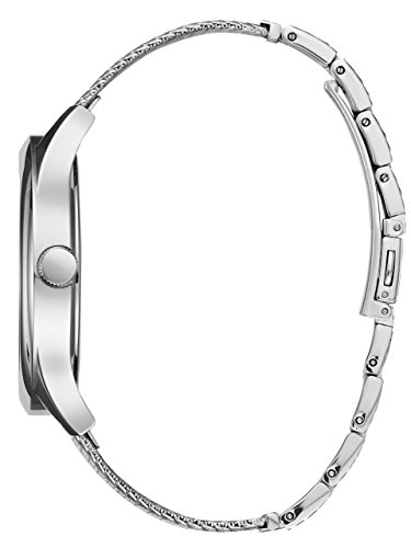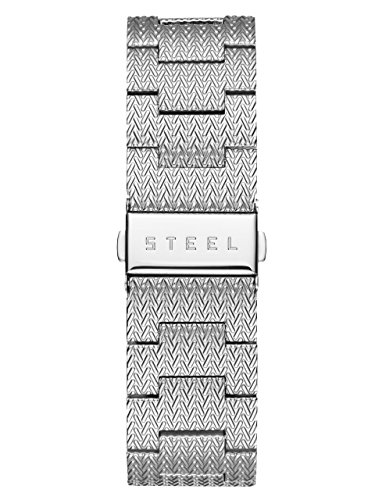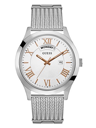 This analog timepiece lends a classic look at the silver-tone bezel, accented with polished dial details. A mesh strap gives a nod to the modern man. Includes day and date functions.