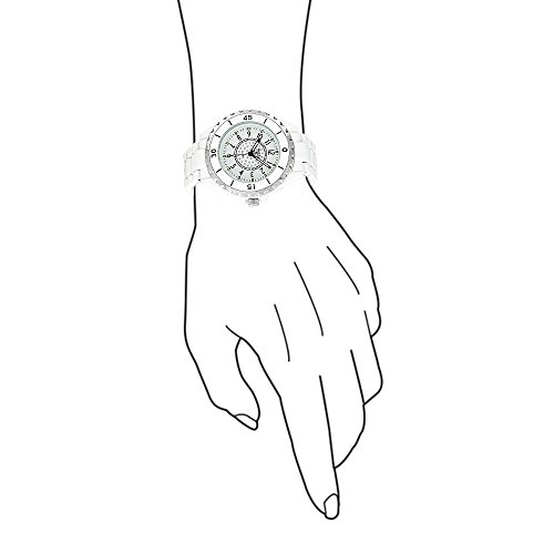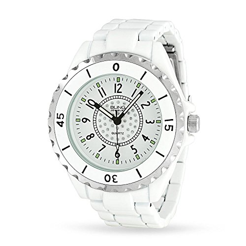 Feel like a rock star with this white enamel, chronograph white dial watch. The glow in the dark hour markers and hour hands, will take you from day to night with ease. It's center dial is embellished with crystals. It's white enamel wrist band compliments it's silver-tone bezel. The light weight, white enamel wrist band with a fold over clasp, will give you a secure and comfortable fit. This watch makes for the perfect gift.