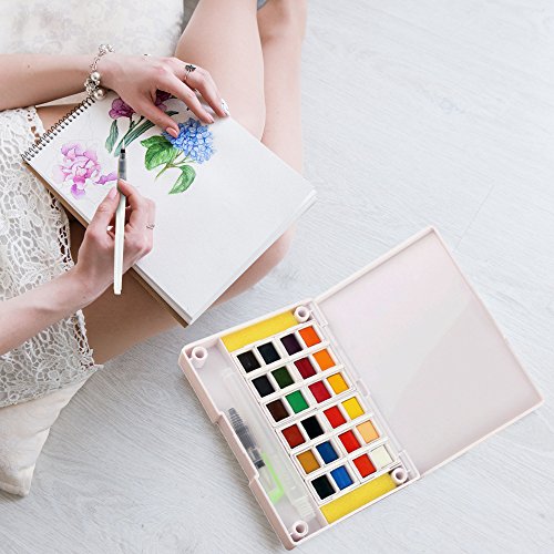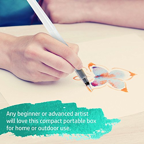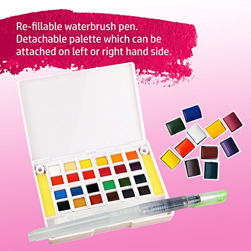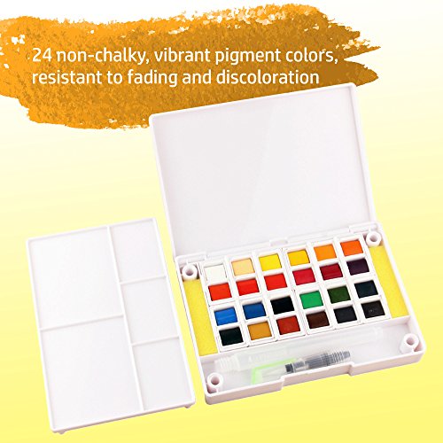 Watercolor Art Set for adults and kids. Best field sketch kit for painters on the go, travel pocket size. 24 paint colors incl refillable water brush pen / mixing palette / FREE paper.