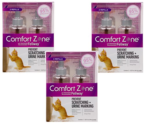 -. Binding : Misc. -. EAN : 0638827651350 -. Feature : Pack of 3 / Clinically proven 95% effective; Veterinarian recommended and drug free / Diffuser sold separately; fits both Comfort Zone and Feliway brand diffusers / Reduce urine marking and scratching / You will recieve 3 - 48 mL refills -. Label : Comfort Zone -. Manufacturer : Comfort Zone -. PackageQuantity : 6 -. ProductGroup : Pet Products -. ProductTypeName : PET_SUPPLIES -. Publisher : Comfort Zone -. Studio : Comfort Zone -. Title : Comfort Zone with Feliway for Cats Diffuser Refill, 48 Milliliters - 6 Total (3 Packages with 2 per Package) -. UPC : 638827651350