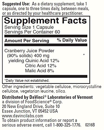 Studio : DaVinci Laboratories of Vermont Publisher : DaVinci Laboratories of Vermont Binding : Health and Beauty Product Description A dietary supplement to support urinary tract function.* The active ingredients in our Cranberry Extract (Malic, Citric, and Quinic Acids), acidify the urine and keep unwanted material from adhering to the cells that line the bladder wall.* 0
