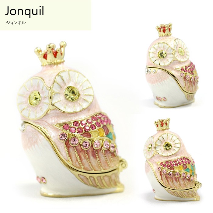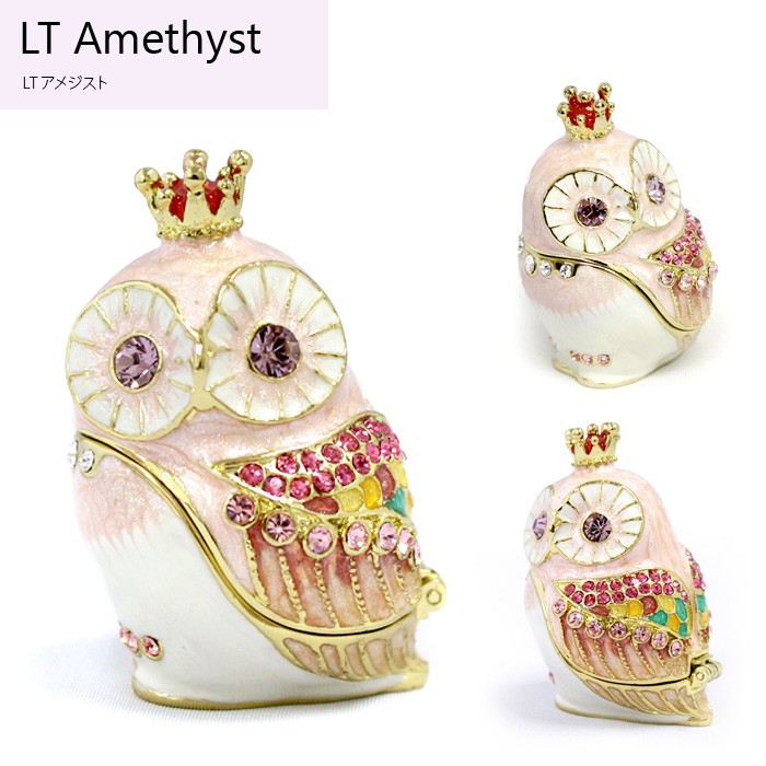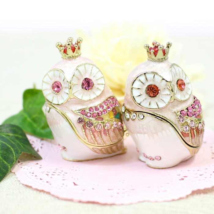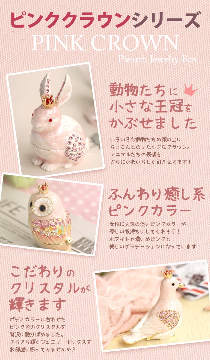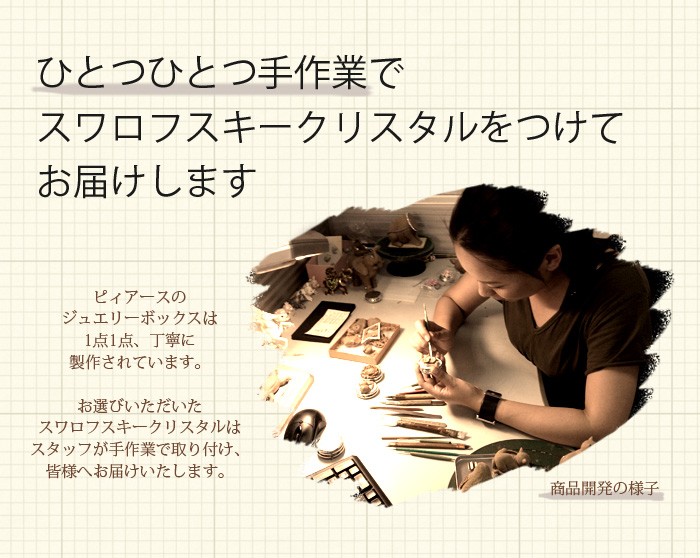 | ジュエリーボックスと言えば、指輪やピアス、ネックレスなどのアクセサリーを入れる引き出し型のケースを思い浮かべる方が多いかもしれません。 ピィアースのジュエリーボックスは、動物や花などをモチーフに作られ、合金製でずっしりとした重さがあります。また高品質のクリスタルガラスを贅沢に使用。まるでジュエリーボックスそのものが宝石のような、高級感溢れる仕上がりです。 小物入れとしても使えるように開閉口には磁石が取り付けてあり、アクセサリーなどなくしやすいアイテムの収納ができます。キラキラと美しく輝く宝石箱は、そのまま飾って楽しめるインテリア雑貨として多くの方に愛されています。 国内トップクラスのジュエリーボックスメーカーであるピィアースは、2004年ごろから本格的に宝石箱の製造を始め、現在のジュエリーボックスはなんと300種類以上。大規模展示会でもご好評いただいており、全国有名百貨店でも販売されています。 自社工場でひとつひとつ丁寧に手作りし、原型作成、研磨、加工、着色、小さなクリスタルガラスの取り付けなども全て手作業で行われるこだわりのハンドメイド品。完成後は厳しい検品の後、丁寧に梱包作業をしお客様にお届けしております。 ピィアース商品は、全国有名百貨店および全国有名宝石店チェーンにてお取り扱いいただいている高品質商品です。 ★自分へのご褒美に…コレクションして並べて飾ると、さらにかわいらしさUP! ★恋人へのプレゼント…中にアクセサリーを入れて、サプライズな贈り物として ★家族への感謝ギフト…お母さんや姉妹へ、日頃のありがとうの気持ちを込めて ★誕生日プレゼント…お友達の喜ぶ顔が見たいから、いつもと違うキラキラギフトを ★小さな女の子へ…まるでお姫様が使っているようなキラキラ宝石箱は女の子の憧れ! |