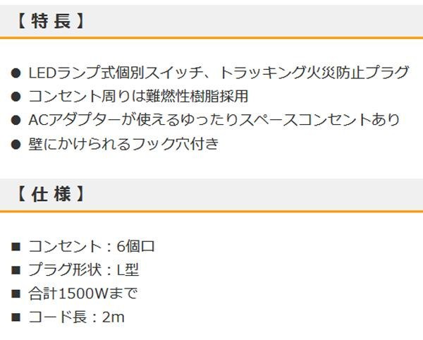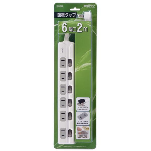 ACアダプターも使えるゆったりスペースコンセントあり。壁にかけられるフック穴付きです。 生産国:中国 ※サプライヤー直送品 ご注文後3~4営業日後の出荷となります【商品名】OHM 節電タップ 6個口 2m HS-TP62A62W