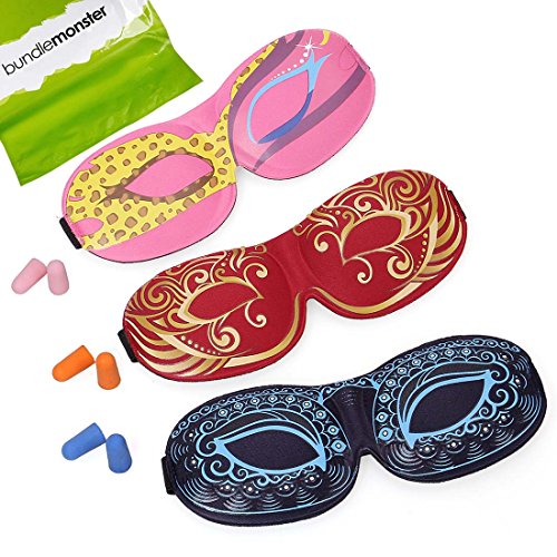This 3 piece sleep accessory set is the perfect gift for those who enjoy a good nights rest. Each set comes with 3 eye masks, 3 pairs of ear plugs, and 3 travel pouches. Set 8 features eye masks with unique pattern eye designs. They feature padding and contours for your eyes and nose so that the mask fits comfortably. The masks are fastened with velcro on elastic bands - full length of masks with bands are roughly 24 inches unstretched (one size fits most). Ear plugs are the standard foam type that are simple to squeeze and insert into your ears to block out surrounding noise. Finally, the soft carrying case is the perfect travel pouch to take these accessories anywhere you want rest. Keep the whole set for yourself or piece it out as gifts! *NOTE*: Due to differences between monitor displays, actual color may vary slightly from image. Bundle Monster is a registered trademark of Remi Collections LLC and is exclusively distributed by Bundle Monster. Bundle Monster trademark is protected by Trademark Law.Feature