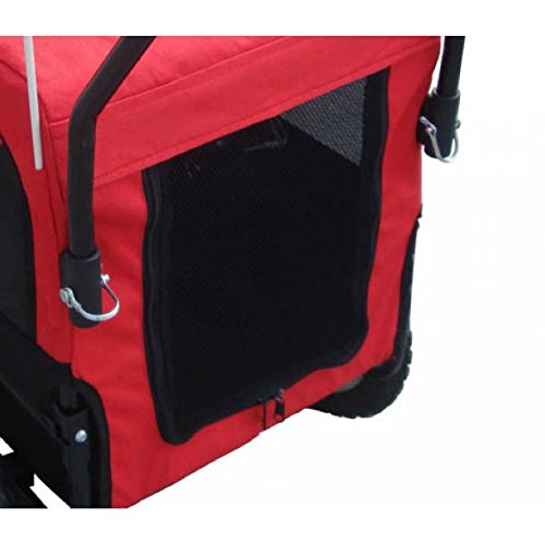 -. Feature : In a few simple steps you can transform this jogger into a dog bike trailer. The netting protects against mosquitos while providing ample ventilation, and the plastic front cover provides for protection against rain. / The material of the trailer is water resistant, durable and easy to maintain. The interior also features a hook for attaching a dog or cat leash.The quick release pneumatic tires, sturdy steel tube frame and safety bar guarantees your pets safety. / A security-rotation coupling stops the trailer when the bicycle falls over, and all models employ a hook on the rear of the bike. Both lightweight and attachable to the shaft, they will spare your bicycle from any damage. / The backside and roof window can be opened and closed with a zipper. The base is reinforced with a special lining which is slip and moisture resistant. The side hinges and wheels are removable so it's easy to store and save space. / The cart has a safety flag on top to draw attention to your precious cargo. This dog trailer can easily be assembled and disassembled without any tools required.