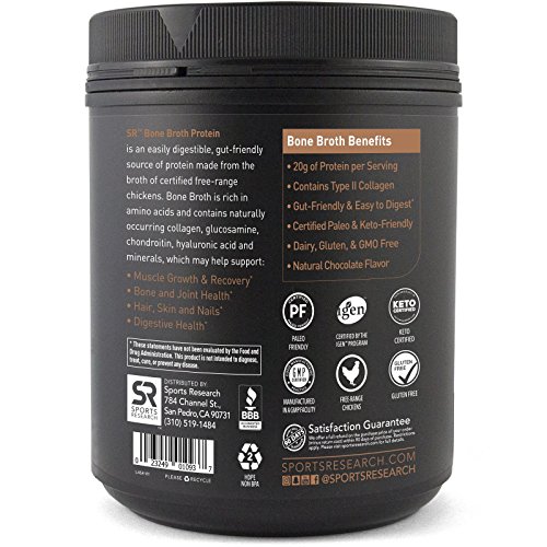 This no-carb, high-protein supplement delivers the bountiful benefits of natural chicken bone broth in a convenient powder form. Blend with your favorite fruits for a tasty, nutrient-dense smoothie. Want to get lean, strong, and sculpted? Whether you're a weightlifting pro or just want to look and feel your best, Sports Research Bone Broth Protein can help you step up your game. Made of 100% chicken, it's an excellent source of muscle-building protein and other nutrients. What's in our Bone Broth supplement? You'll find key minerals like calcium and potassium as well as hyaluronic acid, which may aid in digestive health immunity. It has natural collagen, protein, and amino acids, thought to be essential in muscle repair and lean muscle growth. Our protein powder also includes chondroitin sulfate and glucosamine, compounds believed to have an anti-inflammatory effect and that may temporarily aid in joint pain and swelling. ? 20 grams of protein per serving ? Sourced from free-range chickens ? Packed with nutrients ? Absorbed better by the body than whey protein ? Easy to digest ? No artificial ingredients ? Free of GMOs, gluten, dairy ? Zero carbs / sugars per serving (Paleo-friendly) ? Mixes smoothly with liquids ? Made in the USA Combine a scoop of powder with water, nuts, fruit to create a delicious and filling smoothie that you can enjoy any time of day. Searching for a quality supplement that supports your weightlifting and fitness goals while also promoting whole-body health? You've found it with Sports Research Bone Broth Protein.* Click "Add to Cart" to buy now. *These statements have not been evaluated by the Food and Drug Administration. This product is not intended to diagnose, treat, cure, or prevent any disease. 0 |