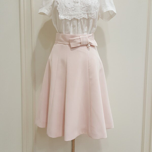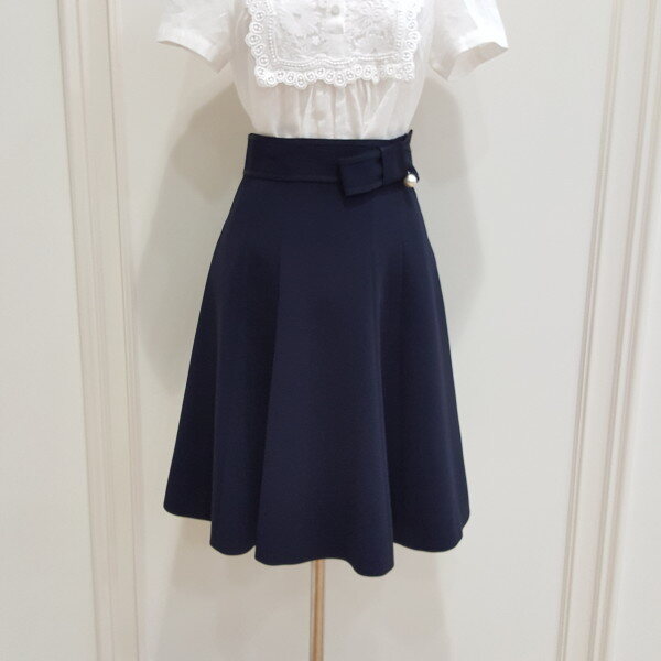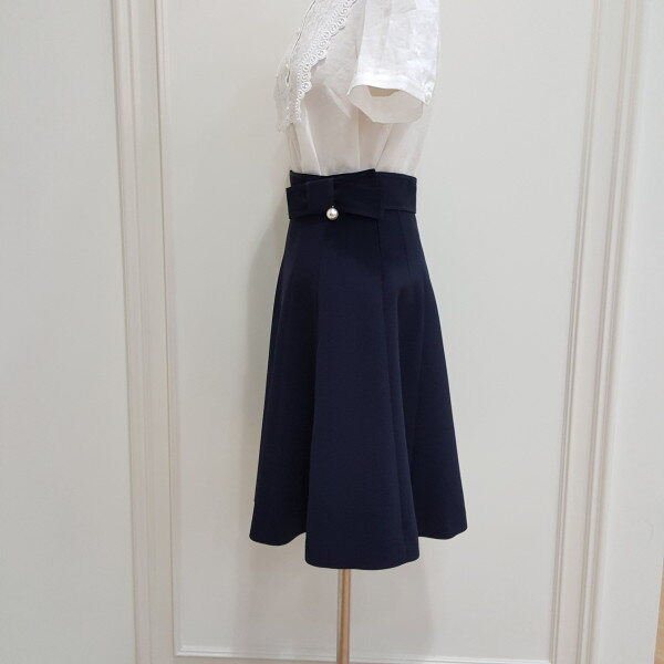 A라인 실루엣의 미디기장 스커트. 리본옵션 벨트로 포인트를 주어 좀 더 여성스럽게 연출가능.