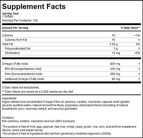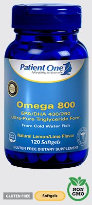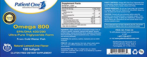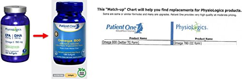 Patient One Omega 800 supplies highly purified and concentrated essential Omega-3 fatty acids in their superior triglyceride form, in an evidenced-backed ratio of 430mg EPA (eicosapentaenoic acid) and 290mg of DHA (docosahexaenoic acid), plus a proprietary antioxidant blend. Certified pharmaceutical grade fish oil sourced from Norwegian cold water fish (anchovy, sardine, mackerel), Omega 800 is molecularly distilled and manufacturer-tested as well as third-party tested for a full range of contaminants and environmental pollutants, including heavy metals, pesticides, dioxins and PCBs. Omega 800 softgels are naturally flavored for a pleasant lemon/lime taste. Fish oils are rich sources of Omega-3 long-chain polyunsaturated fatty acids. Omega-3 fatty acids EPA and DHA are the two most studied fish oils. Most notably recognized for their beneficial effect on cardiovascular health, Omega-3s have also been shown in studies to be beneficial for brain health, blood pressure support, inflammation modulation, joint health and eye comfort. NOTE: Looking for Physiologics Omega-3 780 mg? Please note that this product has been discontinued, and that Patient One - Omega 800 (120s) replaces it using a newer triglyceride (TG) form vs the ethyl ester (EE) form of the discontinued product.Feature