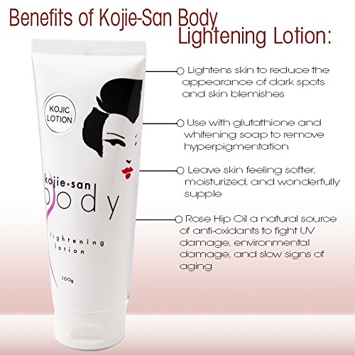 Kojie San Whitening Lotion blends the core elements of skin care to create the perfect skin rejuvenating and whitening experience that makes your skin look and feel amazing! Kojie San Whitening Lotion combats UV damage, environmental damage, and slow signs of aging. Kojie San products are beloved worldwide for their naturally based and scientifically supported benefits. Leave skin feeling softer, moisturized, and wonderfully supple Love your skin with Kojie San.Feature
