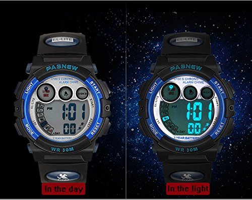 -. Feature : Quartz movement with digital display / PASNEW boys girls watches designed for kids 5-14 years old / 37 mm resin case; Band length fits wrist size 4.7 -8.7 inches;3-Years battery life / FUNCTIONS: Time/date, EL night-light, Stopwatch, Alarm, Hourly chime, 12/24 hour formart / Water-resistant to 100ft, suitable for swimming and surfing. NOTE: *Please don't press any buttons under water; *Wear it while taking a shower, temperature of the water should be lower than 30 degree centigrade
