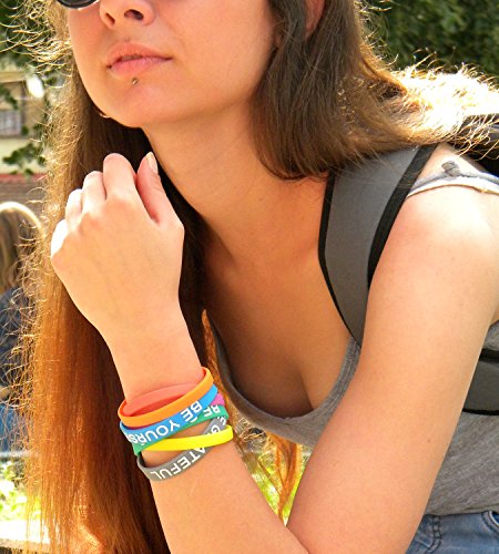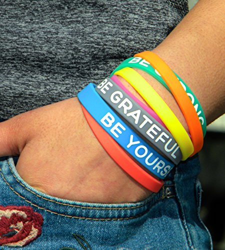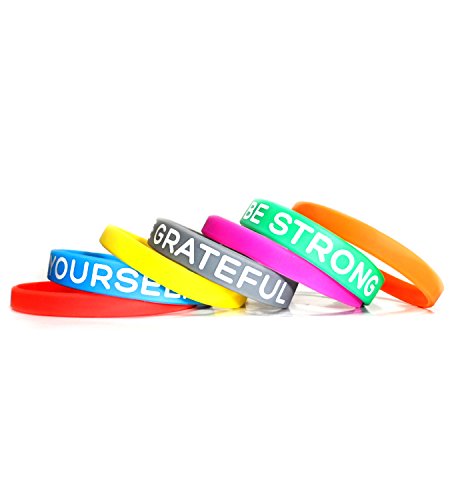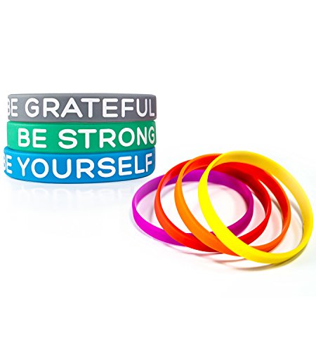 STAY POSITIVE – High quality rubber band bracelets, 3 different motivational reminders in bright and powerful colors: BE STRONG, BE GRATEFUL, BE YOURSELF and 4 plain wristbands