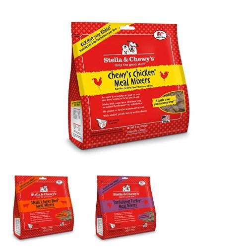 -. Feature : Kickstart Your Kibble! Dogs naturally crave meat, much like they ate in the wild. That's why every batch of Stella & Chewy's Meal Mixers dog food toppers starts with 95% meat, organs and bone plus 100% organic certified fruits and vegetables to guarantee your pet is eating as nature intended. All ingredients are responsibly sourced, and NEVER from China. Add a scoop these yummy morsels to your dog's kibble for a boost of real freeze-dried raw food nutrition and taste / Made in the USA - Meal Mixers' all-natural recipes are crafted with care in small batches in Stella & Chewy's own USA kitchen to provide the highest levels of protein-rich meat and quality grain-free nutrition for your pet / Minimally-processed and all natural. Because the closer foods stay to their natural state, the better they are. That's why each of Stella & Chewy's recipes contains NO added hormones, antibiotics, grains or fillers. Best of all, it's 100% complete and balanced for all life stages / Raw nutrition AND convenience - Your pet deserves to thrive on real, raw meat. Now Stella & Chewy's makes it easier than ever to give your pet real raw nutrition with the convenience of freeze-dried for your dog with Meal Mixers. Simply scoop, mix and serve (scoop included in each bag!) / Supports better health for your pet with improved appetite and digestion, relief from allergies, vibrant skin and coat, healthy teeth and gums, greater stamina and vitality and a healthy immune system / Variety pack of 3 Meal Mixers for dogs includes Stella's Super Beef, Chewy's Chicken and Tantalizing Turkey (9 oz. each)