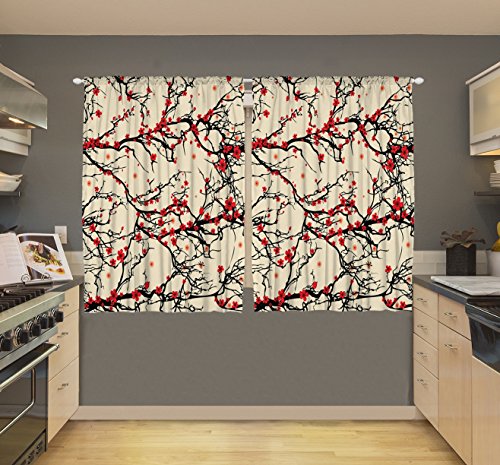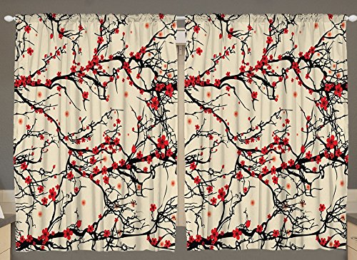 Kitchen Curtains by Ambesonne, Red Flowers 55 W X 39 L Inch Kitchen Dining Room 2 Panels Set Curtains for Window Cream Coral Color Japanese Sakura Blossoms Spring Floral Machine Washable