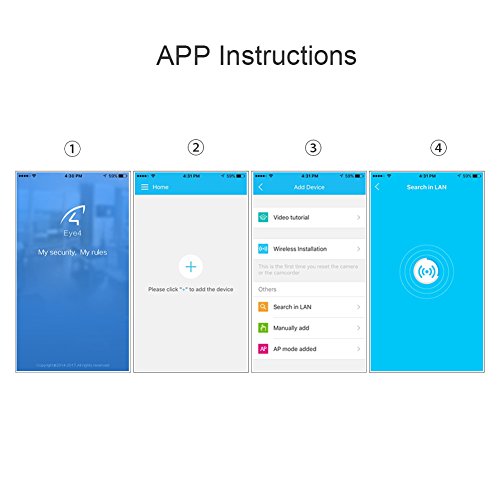 How to connect: 1.Connect your camera with power and router. Download free app Eye4 on your smart phone.