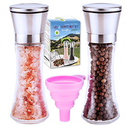 Salt and Pepper Grinder Set -Dry Spice Mill-Brushed Stainless Steel Glass- Pepper Mill and Salt Mill-Adjustable Ceramic Motor-Peppercorns Sea Salt-Fine and Coarse Ground by Surround Point