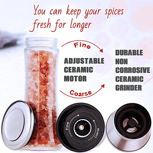 - BECOME A MASTER CHEF: YOUR SEASONING WILL BE PERFECT: Not all salt and pepper mills are created equal,even electric salt mill ,so choose carefully and select only the best quality for maximum performance. This amazing spice shaker set is made of premium, brushed stainless steel and has a tall glass body without any annoying logos on the sides, that allows you to easily monitor spice levels and refill when needed. Made from top quality materials, this salt and pepper mill is made to last.