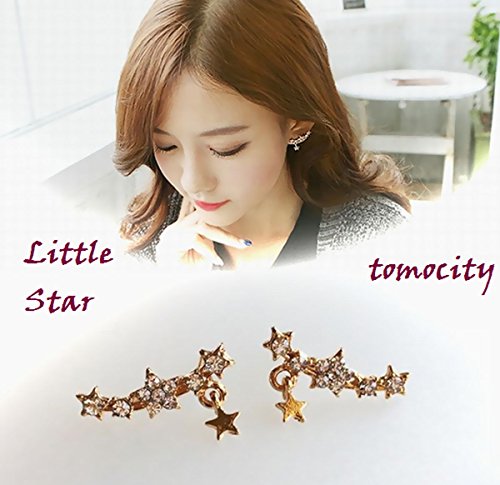 -. Feature : 耳のカーブに添うような曲線とクリスタル輝く星モチーフデザインのピアスです / 下にひと粒揺れる小さな星も、キュートなアクセントになっています / 季節を問わず合わせやすい様々な星モチーフアクセサリーを揃えています ➤➤➤アクセサリーのtomocityをご覧ください