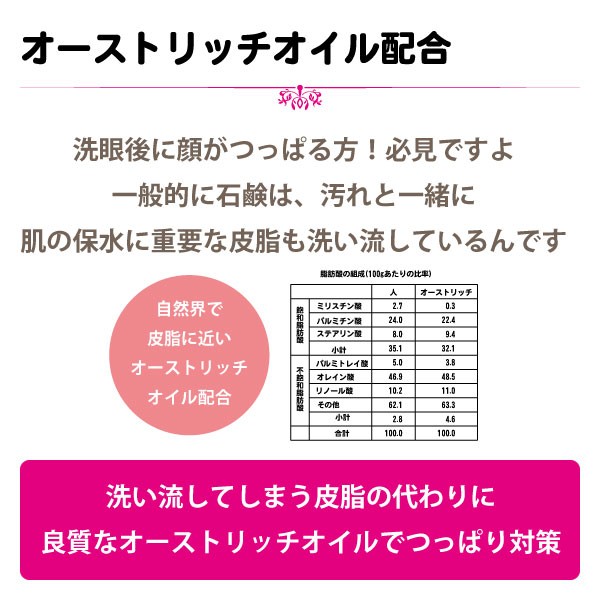 カリ含有石ケン素地、グリセリン、フルクタン、マンナン、ダイズイソフラボン、クリチルリチン酸2K、ダチョウ油、シラカバ樹皮エキス、ローズマリーエキス、マンゴー果実エキス、アルテア根エキス、加水分解コラーゲン、水、エタノール、BG、エチドロン酸、EDTA-4Na |