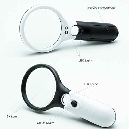 ✔ MAGNIFIER LOUPE 1 - is a premium handheld magnifying glass with bright lights; has 3x magnifier and 45x loupe; perfect for lab or office