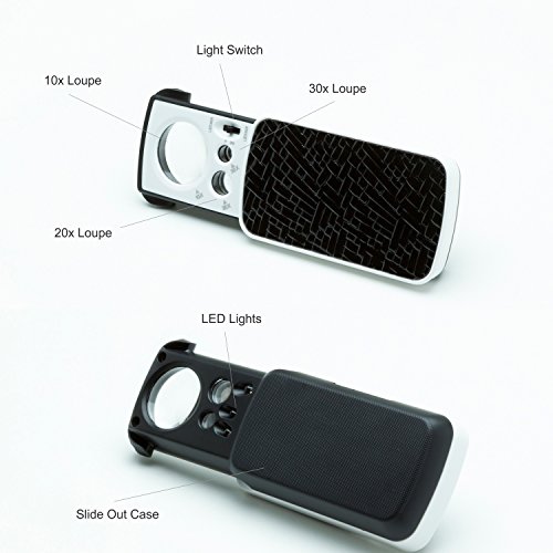 ✔ LOUPE 2 - is a pocket magnifier with light and slide out 10x 20x 30x loupe lenses; perfect for lab, travel & field work; fits perfectly in a pocket, purse, back pack.