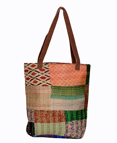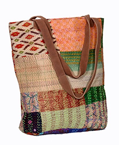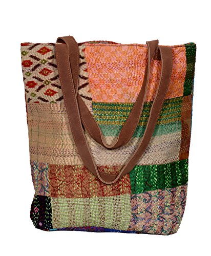 Indistar Silk Kantha Work Leather Handle Handmade Tote, Top Handle Shoulder Bags( 82100-19 )