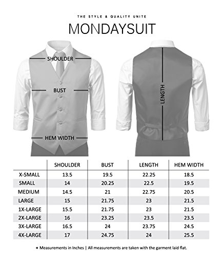 -. Binding : Apparel -. Brand : MONDAYSUIT -. Department : mens -. Feature : 3-Piece Set: Matching Slim Tie & Handkerchief Included / Five-button V-Neck Vest with Welt Hand Pockets / Adjustable Back Buckle and Satin Back / *Editor's Note*: This item runs small in Big & Tall Sizes -. ProductGroup : Apparel -. ProductTypeName : SUIT -. Title : MONDAYSUIT Men's 3 Pieces Set Solid Formal Tuxedo Vest Set (XS~4XL Size)