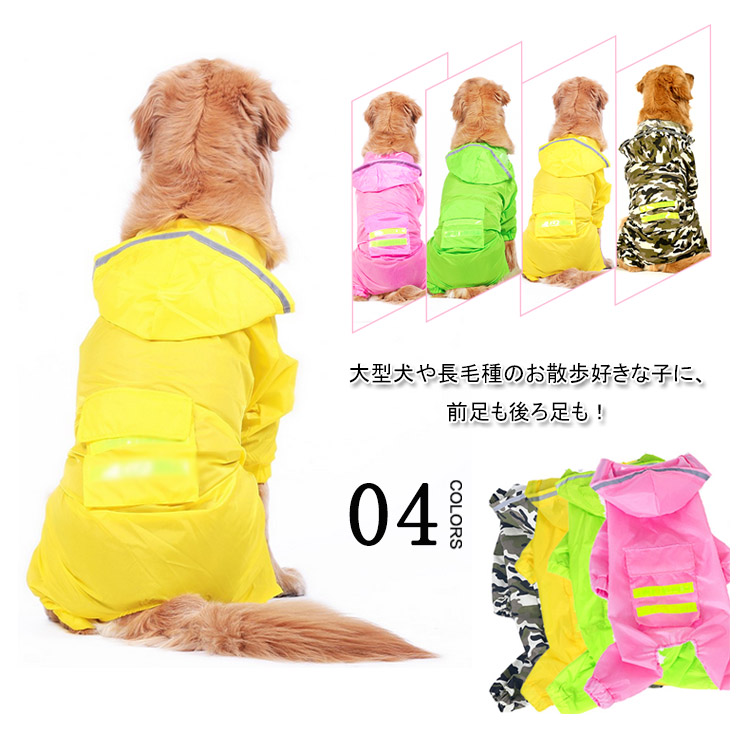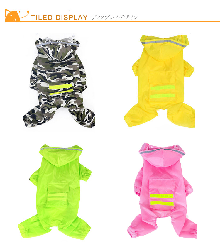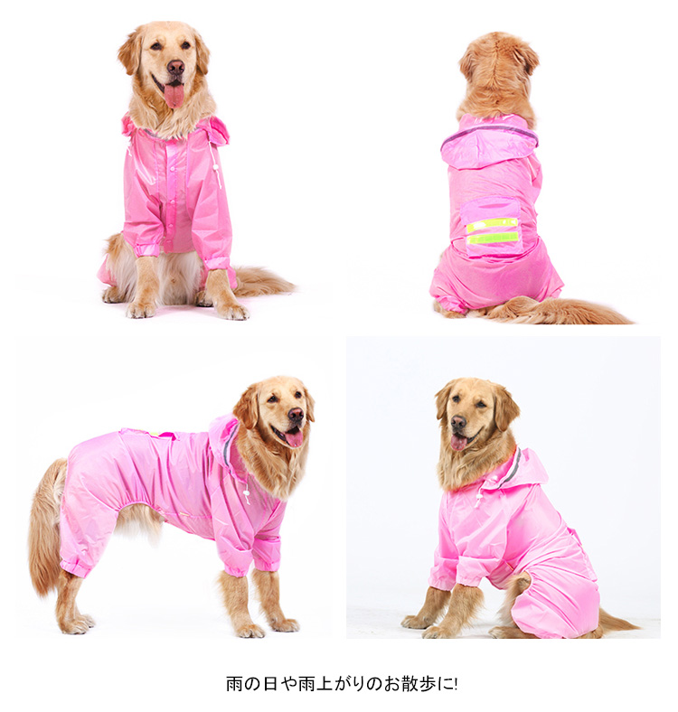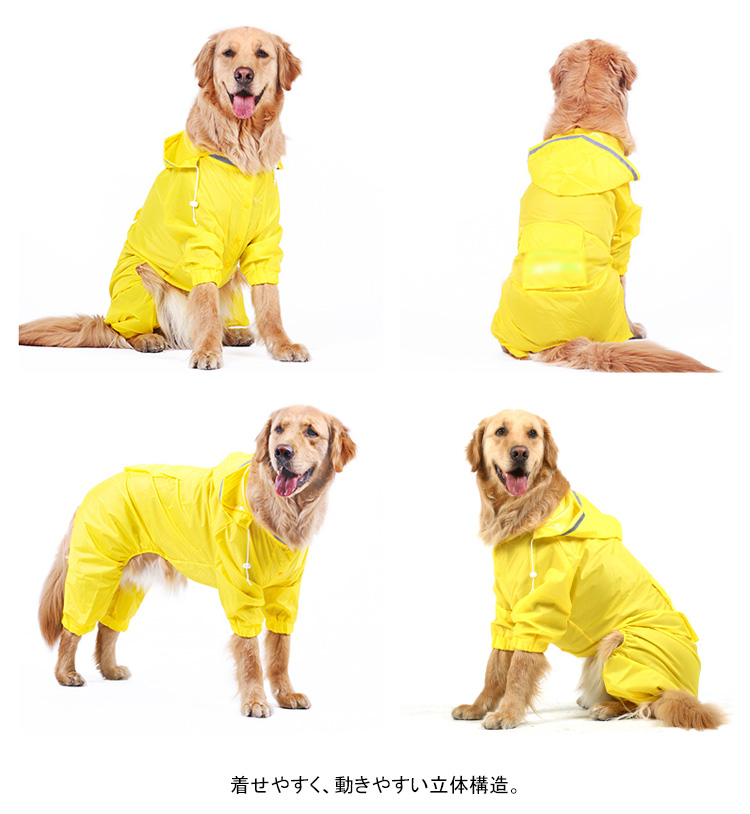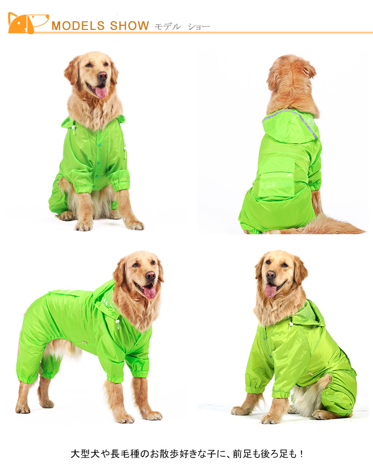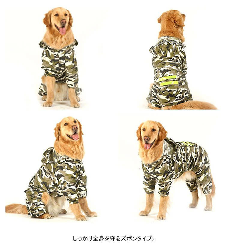 | 大型犬や長毛種のお散歩好きな子に、前足も後ろ足も!しっかり全身を守るズボンタイプ。着せやすく、動きやすい立体構造。雨の日や雨上がりのお散歩に! | |