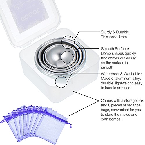 QUANTITY: 4 set of metal bath bomb molds (8 half spheres), 8 pieces of organza bags and a packaging gift box, you can put the bath bomb mold into the box to store