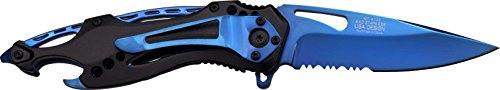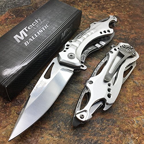 This spring assisted open folding knife from Mtech USA ballistic offers easy one handed deployment. Once open, the blade locks securely into place with the use of its liner lock. This knife features a 3.75-Inch, 3mm thick stainless steel blade. The aluminum handle has a bottle opener. This knife comes complete with a silver stainless steel pocket clip for easy and safe carry. Measures 4.5 inches closed. MTech USA offers a diversified lineup of Tactical folding knives, fixed blade knives, archery products, and security items -- all at competitive prices. The Mtech USA ballistic line consists of all spring assisted opening folding knives.Feature