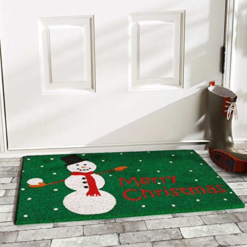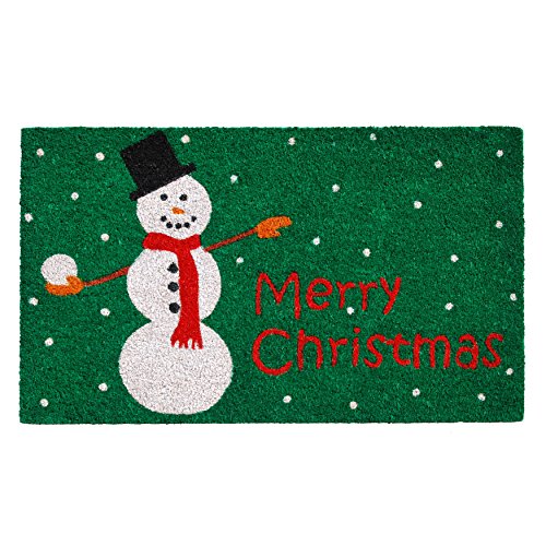 A jolly way to greet guests to your holiday home, the Home & More Christmas Snowman Outdoor Doormat lends a burst of seasonal color to your porch or patio. Brightly colored in green, red, black, brown, orange, and white hues, this vinyl-backed doormat is weather tolerant and moisture resistant. Naturally constructed from coir, this thickly tufted, densely textured mat scrapes and traps wet and dirty messes off shoes and prevents it from coming through your doorway. Dimensions: 29L x 17W in.. Made from 70% coir and 30% vinyl. Tufted doormat. Green, white, and red colored mat. Dense, durable fiber with vinyl backing. Weather tolerant mat absorbs moisture. Will not mat down under high traffic. Centered comic sans text with snowman and dots. Use outdoors.
