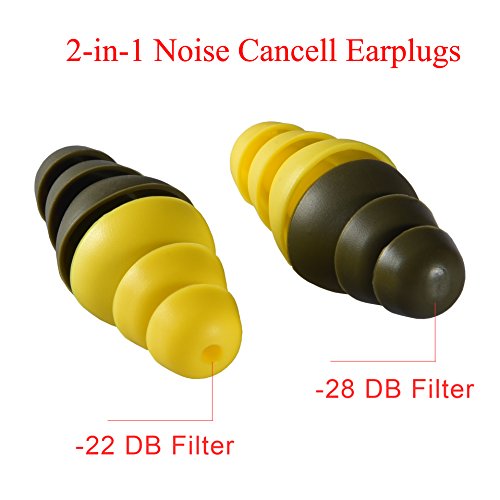 - -- 2-in-1 Noise Cancell Earplugs:One side of the Blackish green noise reduction 28DB, suitable for shooting, construction, auto racing; the other side of yellow noise reduction 22DB, High Fidelity livemusic earplugs suitable for Concert, band practice, Sleeping , Musicians, light industry, sporting events. These are best used in conjunction with earmuffs for INDOOR gun range use.