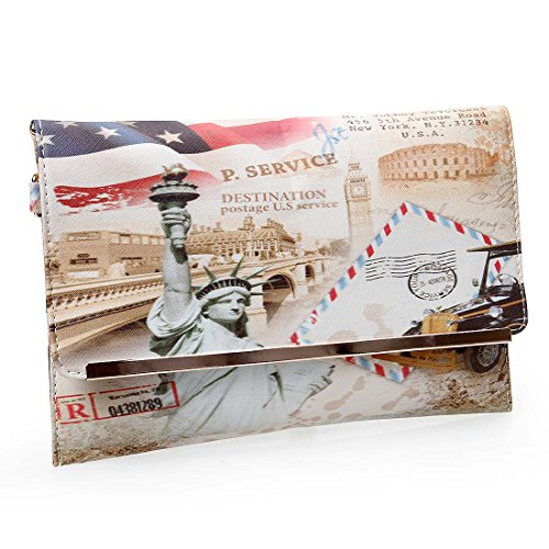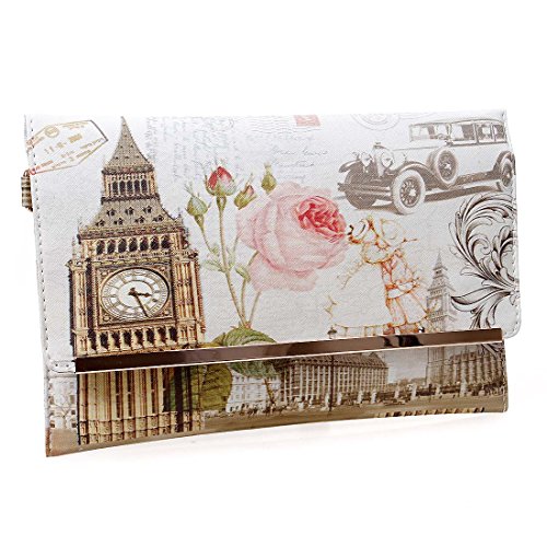 BMC Womens Textured PU Faux Leather Postage Stamp Design Print Flap Fashion Clutch Handbag - London Chic