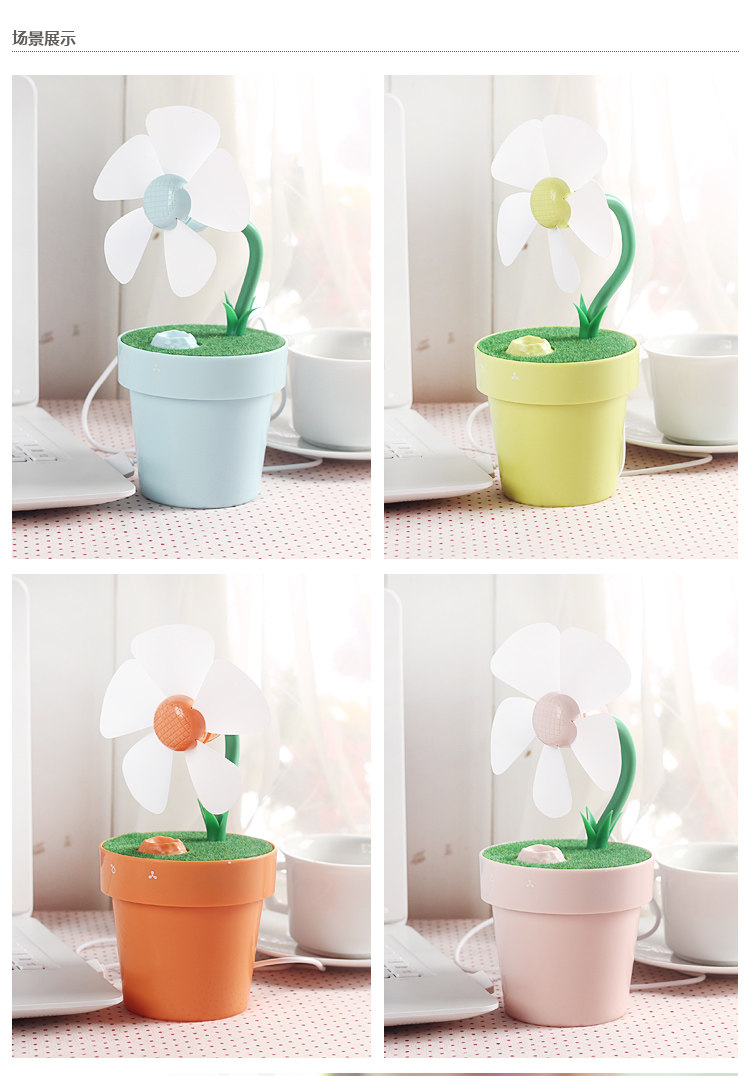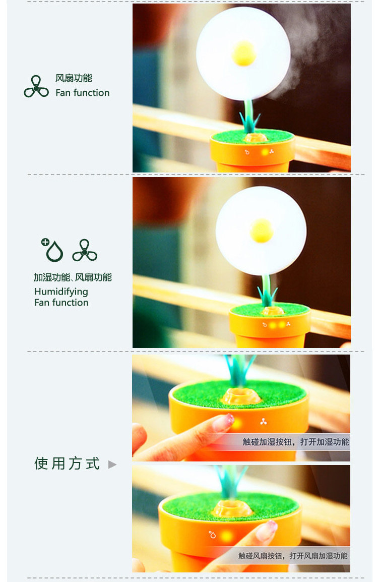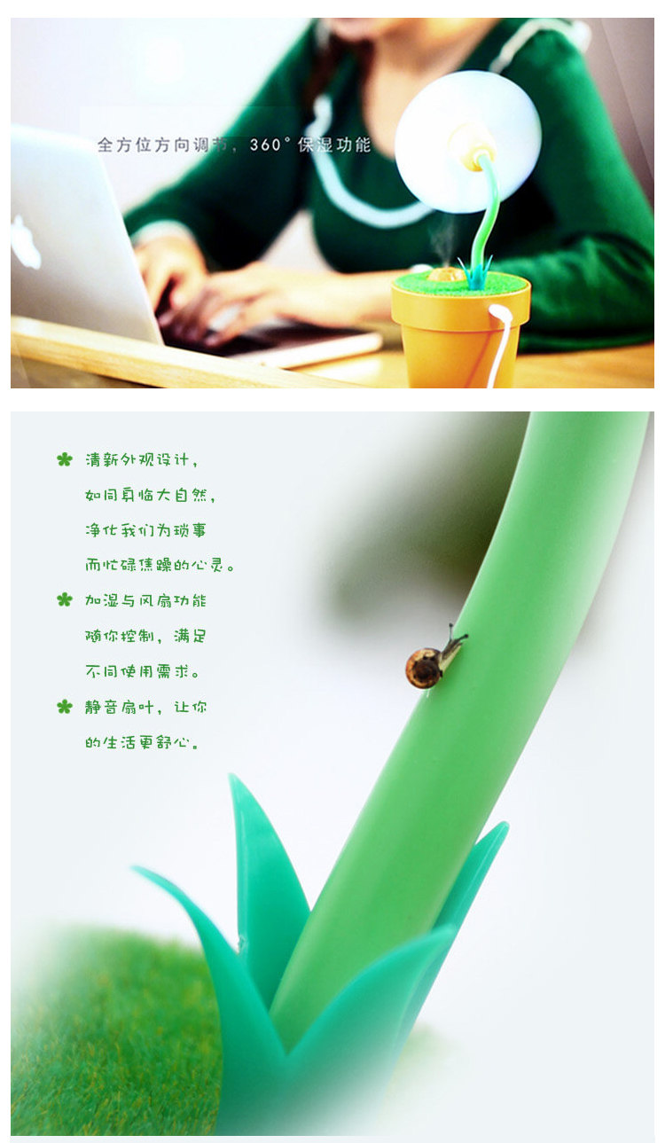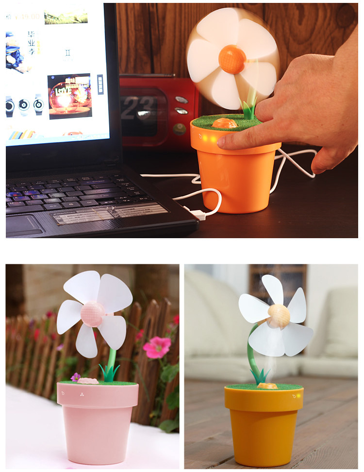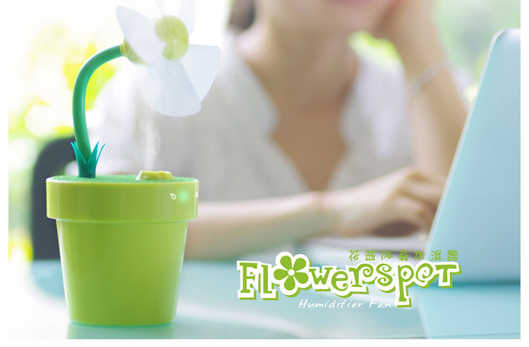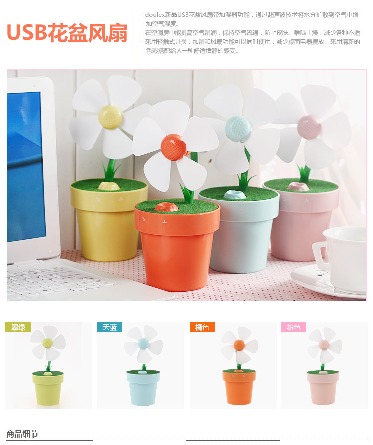 1? doulex new USB flower pot fan with humidifier function? by ultrasound technology will increase the moisture into the air humidity in the air-conditioned room can improve the air moist? keep the air circulating and prevent the skin? dry throat and reduce discomfort.