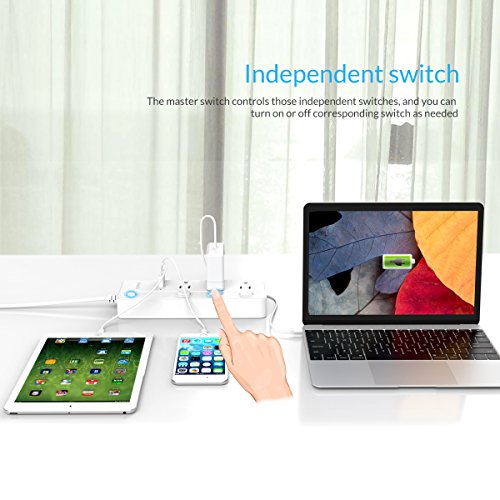 - 3 separate switches control the 3 AC outlet, and a total switch to control the whole power strip; 5ft long power cord is easy to reach most of the original outlet.