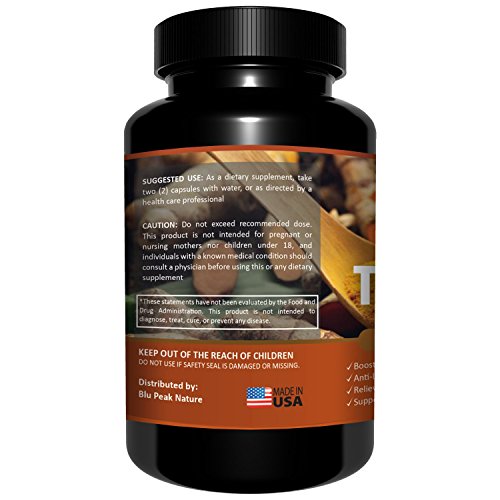 -. Feature : A MAX POTENCY TURMERIC SUPPLEMENT: Enjoy the multiple turmeric benefits in a SAFE, POTENT and highly ABSORBED curcumin supplement! Every serving contains 1310 mg of Turmeric Extract, enriched with Bioperine Black Pepper Extract, making an EFFICIENT pure Turmeric supplement for miracle effects on your health and wellbeing. / STRONG JOINTS, STRONG HEART & A LEAN BODY: Are your joint pains holding you back from your active lifestyle? This turmeric curcumin supplement will relieve pain, offering best protection to your joints! Turmeric is well known for its ANTI-INFLAMMATORY BENEFITS. It can support healthy joints, relieve muscle stiffness, support DIGESTIVE & CARDIOVASCULAR health and enhance MEMORY! It also BOOSTS METABOLISM, making an excellent weight-control tool! / PACKED WITH BIOPERINE: Our turmeric with black pepper supplement contains BioPerine (Black pepper extract) for enhanced bioavailability. It will significantly increase nutritional compounds absorption in the body. Our supplement is manufactured in SGS-accredited facilities bearing IFS Food Certification, while following the strictest GMP, to make an ABSOLUTELY SAFE for health dietary supplement. / BETTER TURMERIC SUPPLEMENT OR YOUR MONEY BACK: Your satisfaction is our TOP P.R.IORITY, this turmeric curcumin supplement is backed by our 100% Blu Peak Money-Back Guarantee! If you are not positively thrilled with our supplement, just let us know and we will return your money in full. / THE ALL NATURAL GIFT OF MOTHER EARTH: Why compromise with anything less than perfection when it comes to your dietary and turmeric supplements? Invest in this ALL NATURAL, 100% vegan supplement today and forget about undesired side-effects! Our VEGGIE CAPSULES are free of preservatives, artificial colors, binders, fillers and GMOs, making a great curcumin with bioperine supplement for men and women of all ages!
